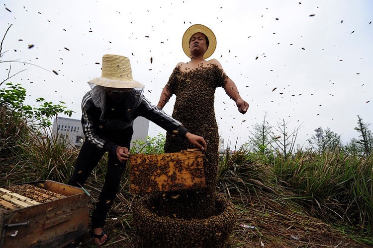 The pictures capture the way a moment feels sometimes, stretched wide and deep. The bees gathered clinging, swarming for the time it took to capture them on film and then, I imagine, they were gone. Time paused, like a butterfly alighting on a flower, long enough for the man to practice some deep breathing, long enough to feel the full weight of that particular moment.