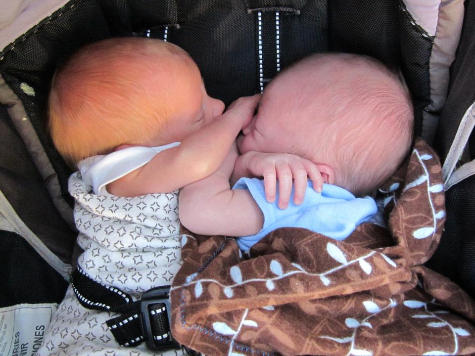 When the twins were first born they both fit in one single stroller and routinely fell asleep tangled together.