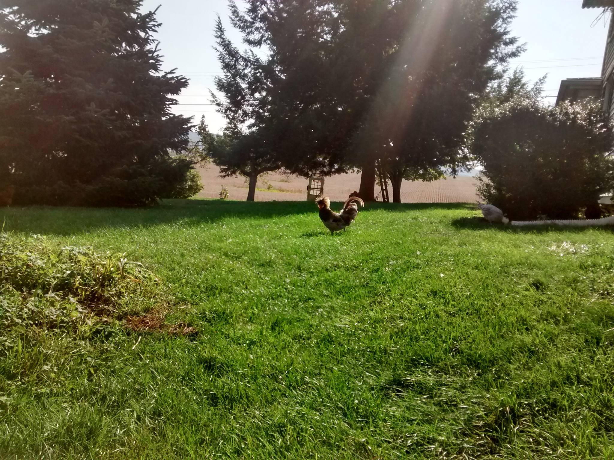 Thursday morning I printed off a how to manual for formatting the inside of a book and sat outside highlighting the parts I thought would apply to the job ahead of me that afternoon. It was a beautiful fall day, enough to warrant (in my mind) printing the 70 plus page manual. Looking up, I caught this picture of our rooster, Joker silhouetted by the sun. You can see the farm stand in the background.