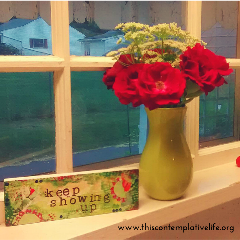 I painted this little plaque last year, based on a note I had taped above my painting station, “Keep showing up.” My kids asked what it meant, and I said, “It means keep trying, keep being willing to be where you are, to start again in whatever moment you find yourself in.”